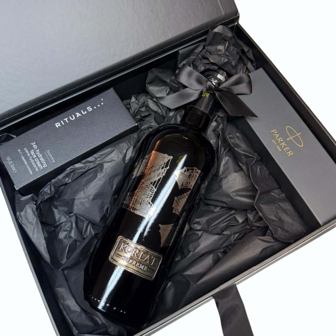 Za muškarce s istančanim ukusom osmislili smo premium poklon-set koji spaja vrhunsko vino, odabrane čokolade i elegantne detalje. Pažljivo balansiran i profinjeno upakiran, ovaj Premium Box idealan je izbor za darivanje uz dozu stila i karaktera.