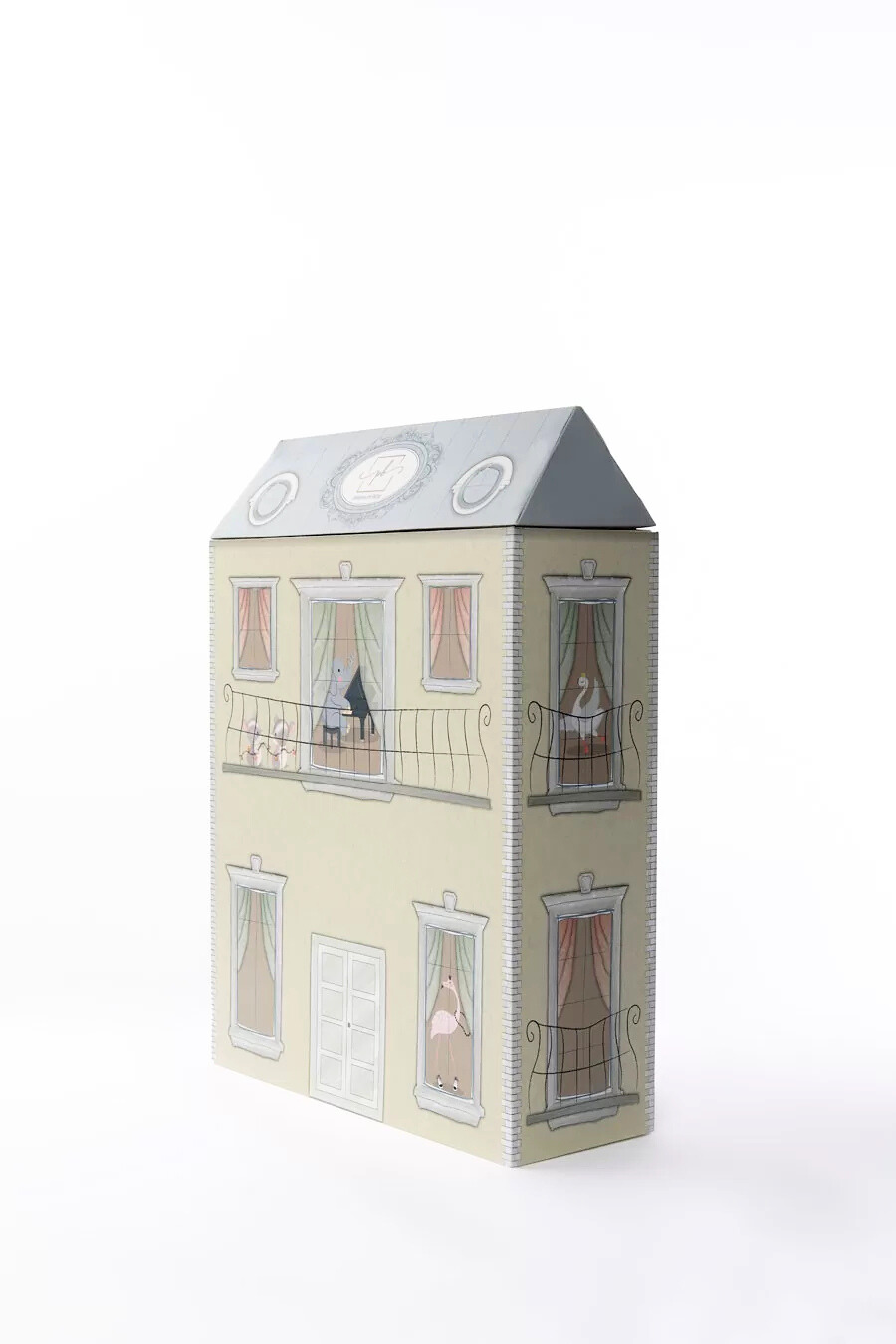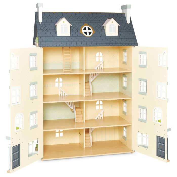 Riječ je o najluksuznijoj i najvećoj drvenoj Le Toy Van kućici. Sadrži ukupno 5 katova, a svaki krasi različit uzorak nježno plavih tapeta. Spremna je za useljenje vaše male kraljevske obitelji lutaka! Sadrži također mnogo prozora, čak i sa stražnje strane, a većina se može otvarati. Klinci će uživati u igri s lutkicama koje će s kata na kat prelaziti stepenicama s rukohvatima, a do tavana ih vode male drvene ljestve. Detalji poput male nadstrešnice iznad ulaznih vrata i zlatni ukrasi po pročelju kućici daju poseban šarm.